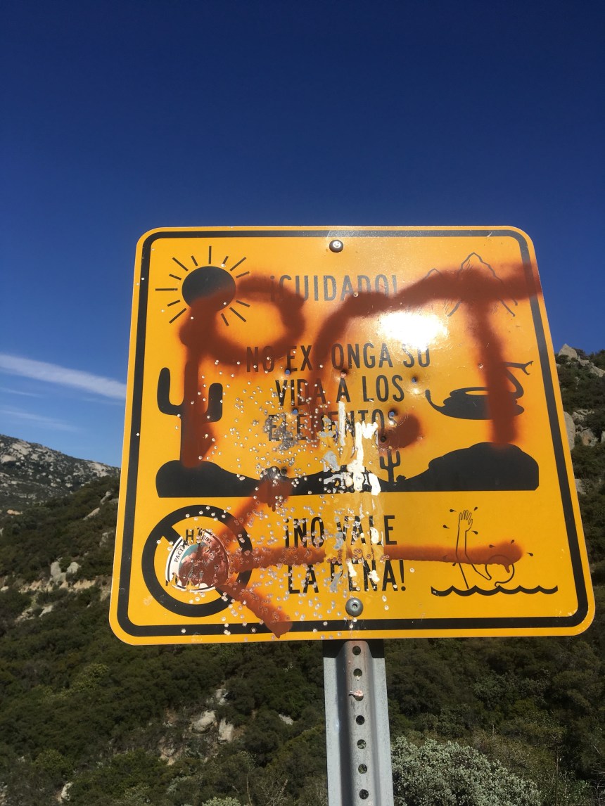 Rachel and I swing out of Mount Laguna the next morning, past a man walking his wolf on a long lead (ok…) and the trail takes us up out of the trees and into something that looks more like what I think of as desert: steep canyons, burnt yellows and oranges. no plants in sight. We continue along the ridge, looking out over this new barren territory, and wonder if that’s what we’ll be heading down into tomorrow. Or if it’s Arizona. Pass. Geography never was my strong point.